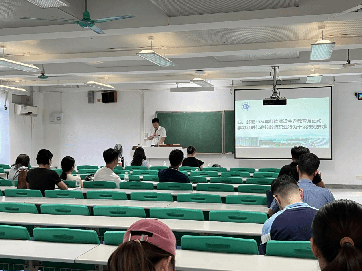杨帆副书记部署2024年师德建设主题教育月活动。他强调,要坚持以习近平新时代中国特色社会主义思想为指导,大力弘扬教育家精神,持续健全师德师风建设长效机制,着力加强新时代教师队伍建设。同时,全体教职工共同学习了新时代高校教师职业行为十项准则要求,杨帆副书记要求教师们要严格遵循新时代高校教师职业行为的基本规范,潜心教书育人,努力成为“四有”好老师、新时代“大先生”,着力培养德智体美劳全面发展的社会主义建设者和接班人。
