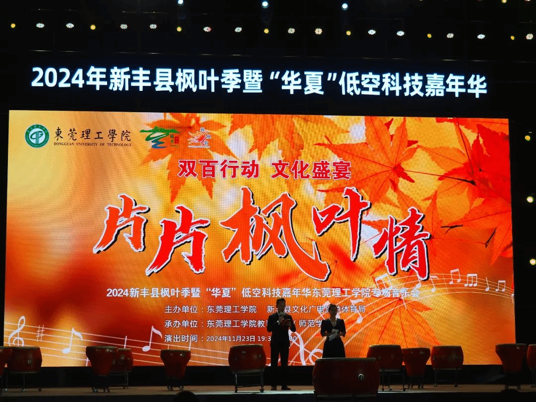 为充分发挥学校学科专业优势,推进“双百行动”在新丰县走深走实,促进校地文化的双向交流与融合,近日,公司以“双百行动,文化同行”为主旨,以2024年新丰县枫叶季暨“华夏”低空科技嘉年华的举办为契机,协同新丰县文化广电旅游体育局主办了题为“片片枫叶情”的专场音乐会。