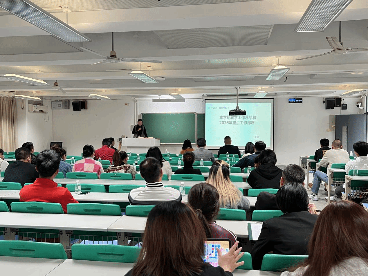 黄琼副经理对2024—2025学年上学期教学工作进行了总结并部署下学期任务。黄院梳理了学院取得的成绩,指出在教学资料归档、教学规范意识、加强课堂管理等方面存在的问题,并提出建立团队库、加强教师培训、规范教学流程等针对性解决措施。明确了2025 年教学工作重点,包括推动审核评估整改、推进师范专业认证、修订人才培养方案及落实学院目标责任,尤其强调课程思政建设、社会需求融入人才培养及专业与 AI 融合等关键工作。