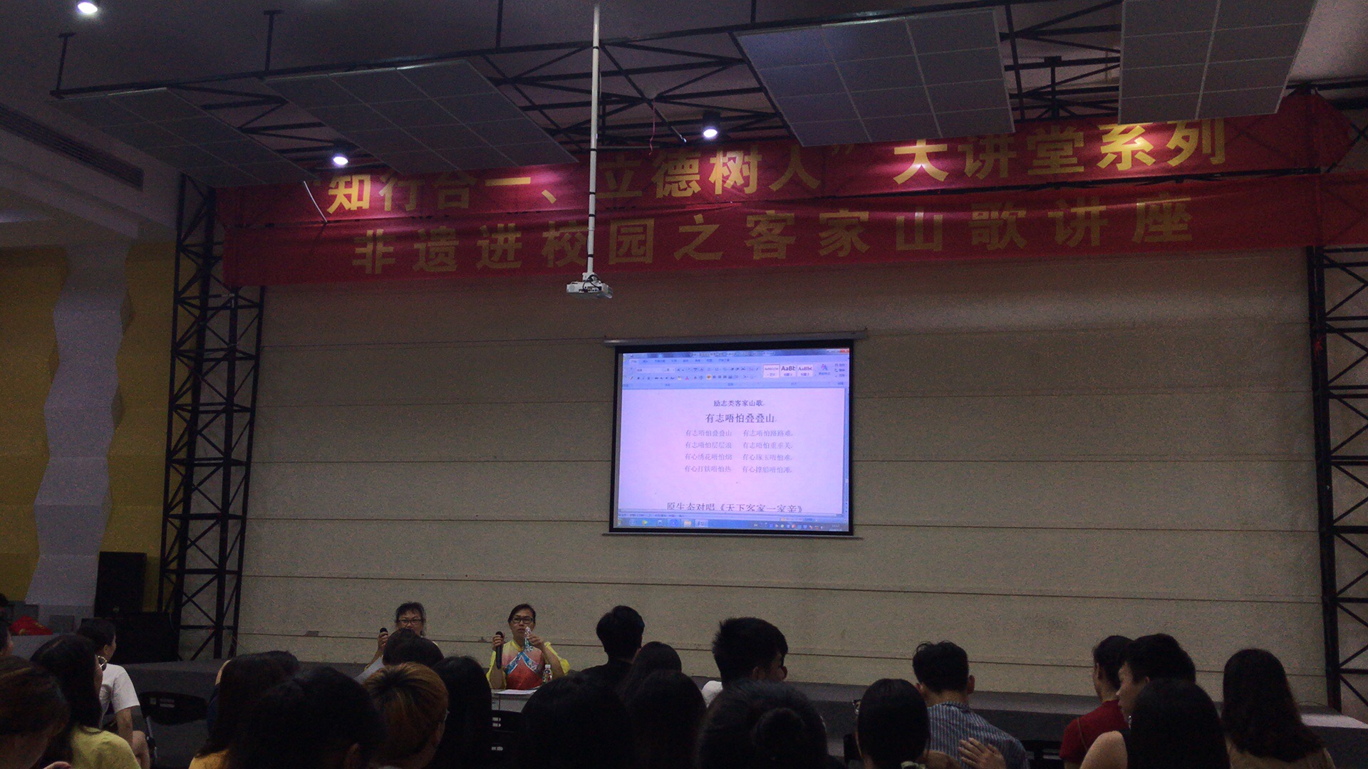 2018年7月5日,太阳城在艺术楼演奏厅举办了“非遗进校园——客家山歌进校园”专题讲座活动。本次讲座的主讲人,是现任凤岗客家山歌协会会长刘桂芳老师以及凤岗镇非物质文化遗产客家山歌第三代传承人杨艳芬老师。