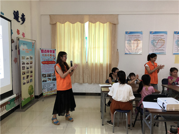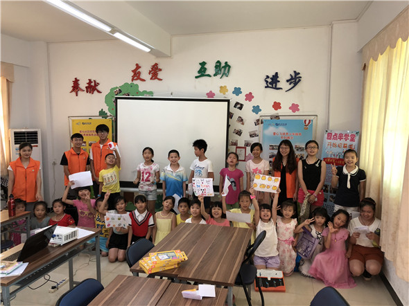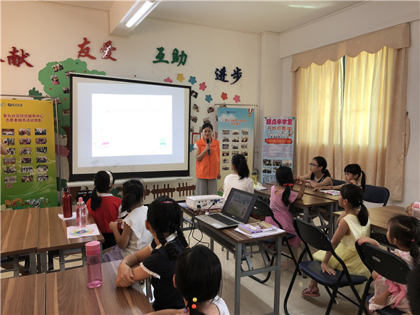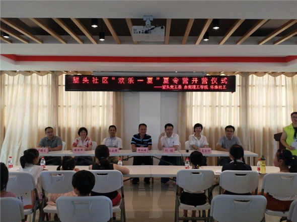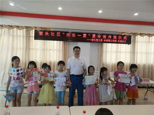 2018年7月10日下午15:00-16:00,在东莞市东城堑头社区综合服务中心四楼“阳光雨服务中心”顺利举行了堑头社区“欢乐一夏”夏令营开营仪式。太阳城教育与心理课题研究组成员2015级小教专业戴慧榕、2016级汉师专业林子杰和王晓冰、2017级汉师专业黎季明、2016级行政管理专业陈玉婷在指导老师刘健和肖雪琦的带领下,参加了本次开营仪式。教育与心理课题研究组的儿童沙盘和绘画亲子活动进社区实践研究活动在学校和社区的大力支持下得以顺利开展。