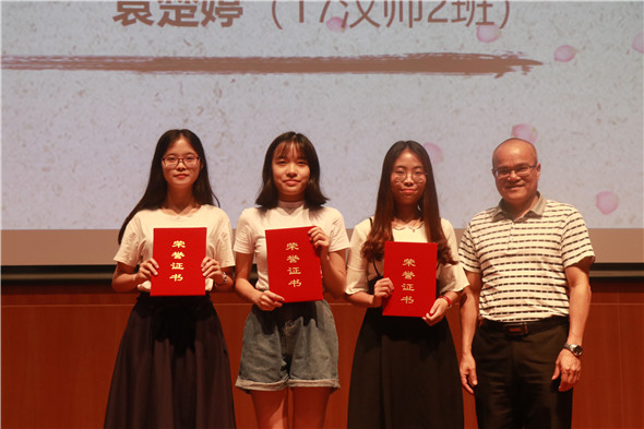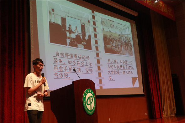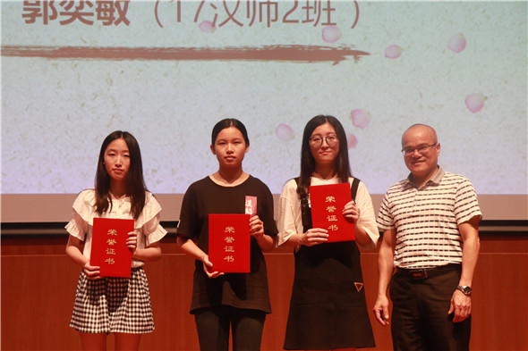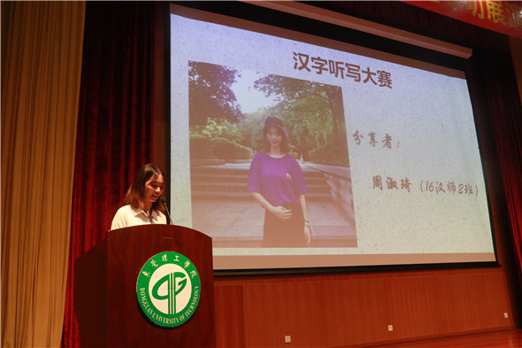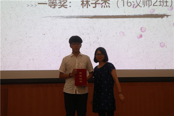 首先,教育系主任刘蕾老师致闭幕词,接着,举行了颁奖仪式。颁奖环节为五场比赛获得一等奖的选手颁发了获奖证书。接着,老师们对各项比赛进行了点评。随后,郑陶凌老师和朗诵比赛的获奖选手龙子真、林晓芳、李漪琳为观众带来了精彩的朗诵《春天 遂想起》。随后是在PPT大赛中脱颖而出的来自(15汉师班)苏仲健同学的作品介绍。紧接着是获得汉字听写大赛一等奖的16汉师2班的周淑琦同学发表感言。当晚,一等奖的获得者来自16汉师2班的陈乐如同学为观众们带来了演讲《不一样的选择,不一样的收获》。