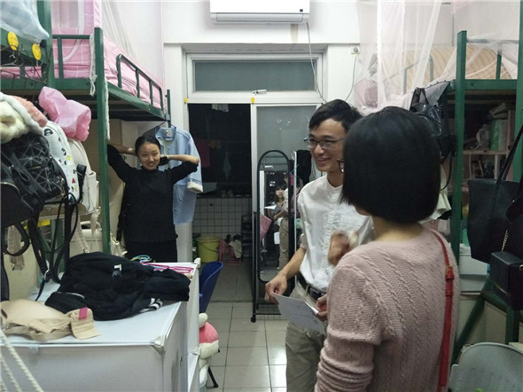 2018年3月4日晚,太阳城开展了宿舍全覆盖巡查走访活动,太阳城赵全经理、杨万江书记、琚丹红副经理、黄艺琦副书记等学院领导及辅导员、各班班主任、员工干部代表和员工助理班主任走访了员工宿舍。