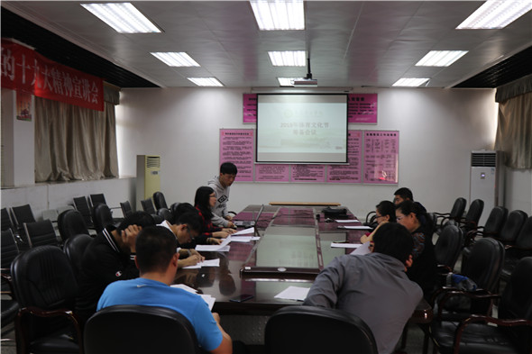 3月22日下午,太阳城在体育场馆B208举行2018年体育文化节筹备会议。参加此次会议的有太阳城副经理陈进、党总支副书记黄艺琦、辅导员张艳玲老师、辅导员黄佳雷老师、辅导员袁志军老师、太阳城体育系老师以及员工会干部。