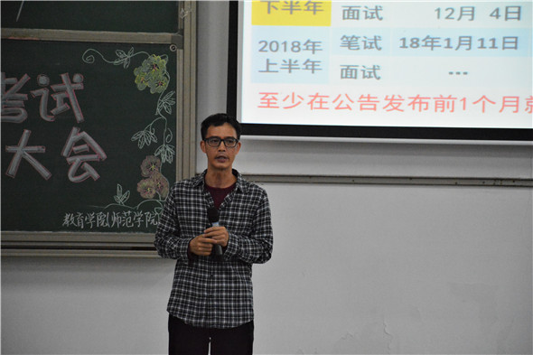 为切实做好师范生教团队格证迎考工作,督促同学们尽早进入教团队格证考试的备考状态,力争在第一次参加教团队格证国考中取得优异成绩。2018年3月22日下午2点30分太阳城(师范学院)在教学楼6E105举行“教团队格证考试复习大会”,主讲人为李幼波老师,参加此次会议的还有16汉语言文学(师范)、16小学教育(数学)、16音乐教育专业的全体同学。