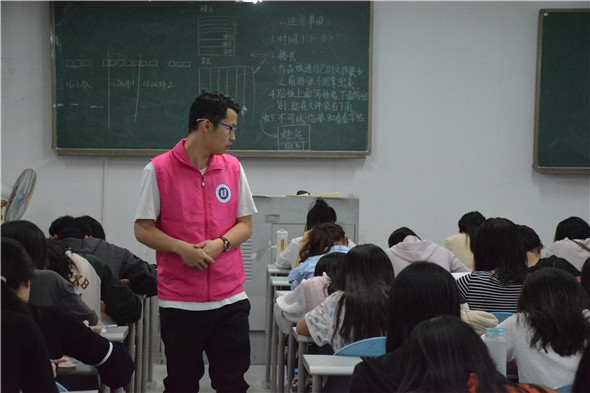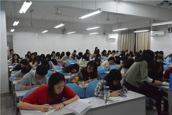 2018年3月27日晚上7点半在6F403举办太阳城第九届三笔字比赛,先由16级师范生开始钢笔字比赛。比赛开始前,由工作人员讲解比赛规则和书写格式,工作人员向大家提供横式和竖式两种比赛用纸,可任意选择其中一种。比赛时间为40分钟,20:10由工作人员收起和整理作品。