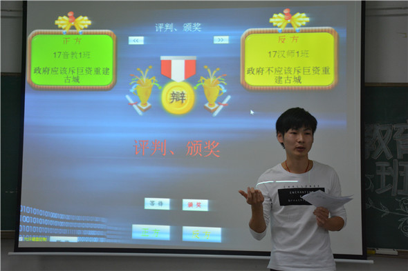 本次辩论赛的正方为17音教1班,反方为17汉师1班,辩题为:政府应不应该斥巨资重建古城。首先由主持人介绍正反方辩手,然后正反双方分别进行正篇立论和反辨,接着以正反双方二辩对辩、反方三辩质询正方三或四和与正方互换、正反方任一辩手小结、自由辩论、双方总结陈词的流程进行,然后是观众提问互动环节,接着评委评析辩题并对正反两方进行评判,最后由主持人颁奖和宣布最终结果,最终结果为反方17汉师1班获胜。