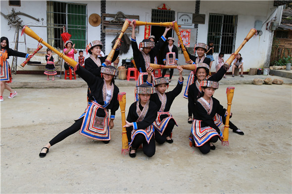 6月18日早晨,采风队伍继续前往吉田镇学习瑶族歌舞。在瑶家山庄,曾经于1987年接待过时任中央书记处书记习仲勋同志的周瑞英大姐热情地招待了我们。在这里师生们一同参观了瑶家人的百果园、吊脚楼,还观赏了一场瑶族歌舞盛宴。同学们的学习热情极高,当地的瑶民也耐心地手把手教同学们跳长鼓舞,现场气氛热烈、其乐融融。同学们不仅收获了听觉和视觉的文化震撼,同时也领略了少数民族音乐文化的独特魅力。