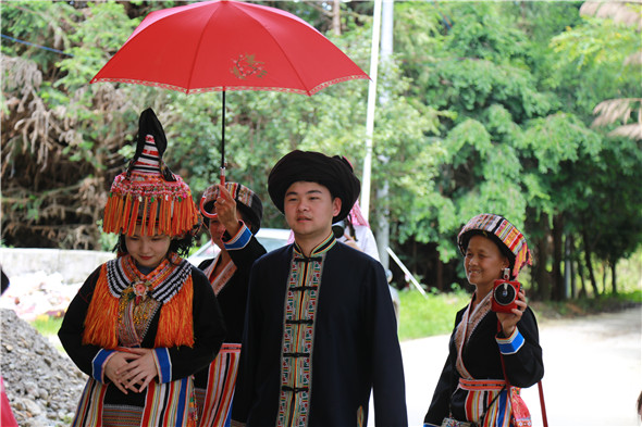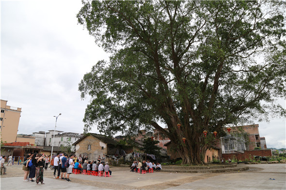 当天下午,在连山文化馆戴永辉副馆长的指引下,师生一行来到小三江镇文化广场,在一棵大榕树下聆听了原生态壮族山歌。歌者都是五、六十岁的长者,他们一般会在当地的墟日结集在一起唱歌、对歌。壮族山歌的曲调相对比较固定,歌词即兴性较强,歌曲内容主要反映歌者的生活和劳作,用于宣泄情感,感情真挚、自由直畅。在加田镇文化中心,市级民歌传承人梁联英等人的即兴山歌演唱尤为精彩,几位歌手为表达见到远方来客的欣喜,即兴高歌一曲献予在场师生,表达了对教师职业辛勤教育的感激及对老员工学习生活的美好祝愿。