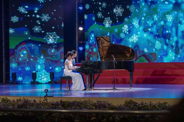第一篇章「茧迹·向光之鸣」由叶庭康带领的打击乐团拉开序幕。一曲《赤鼓·先锋》将悠扬的民族鼓韵与现代金属打击乐巧妙结合,激昂的节奏与独特的编排瞬间点燃全场。随后,陈沛桦以独唱《念奴娇·赤壁怀古》重现苏轼笔下的历史豪情,磅礴的旋律令观众动容。王艺璇与叶依洋的四手联弹《雪橇幻想曲》则以灵动的音符勾勒冬日雪境的浪漫画卷,民乐团合奏《象王行》恢弘大气,卢心诺独唱的巴洛克咏叹调《坚如磐石》则展现了女高音的华丽技巧。