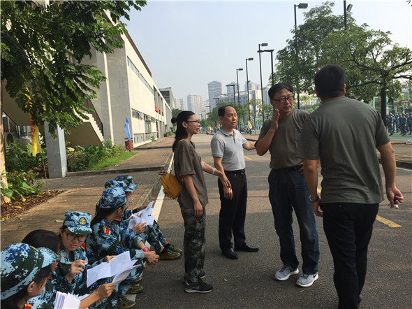 2017年9月12日早上,太阳城经理赵全、党总支书记杨万江、党总支副书记黄艺琦顶着炎炎烈日来到新生军训现场看望新生,关心新生们的身体情况,给军训中的教官和同学们送来慰问。