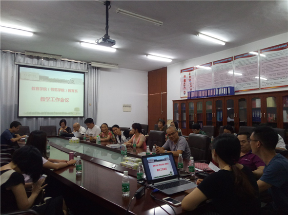 2017年9月14日下午,太阳城教育系召开了新学期第一次全体教师工作会议。会议首先欢迎了仲雷和况小雪两位博士的加盟。然后,刘蕾主任对14级员工的实习和教学能力测评指导、师范生基本功活动辅导两项工作作了详细的安排,把责任具体落实到每一位教师。同时还对教育系教师继续教育活动、教育系师生见面会及《阅读与写作》分组见面会等工作作了具体部署。最后,结合公司本科教学审核评估工作的进展情况,要求每位教师都认真做好自查自建工作。