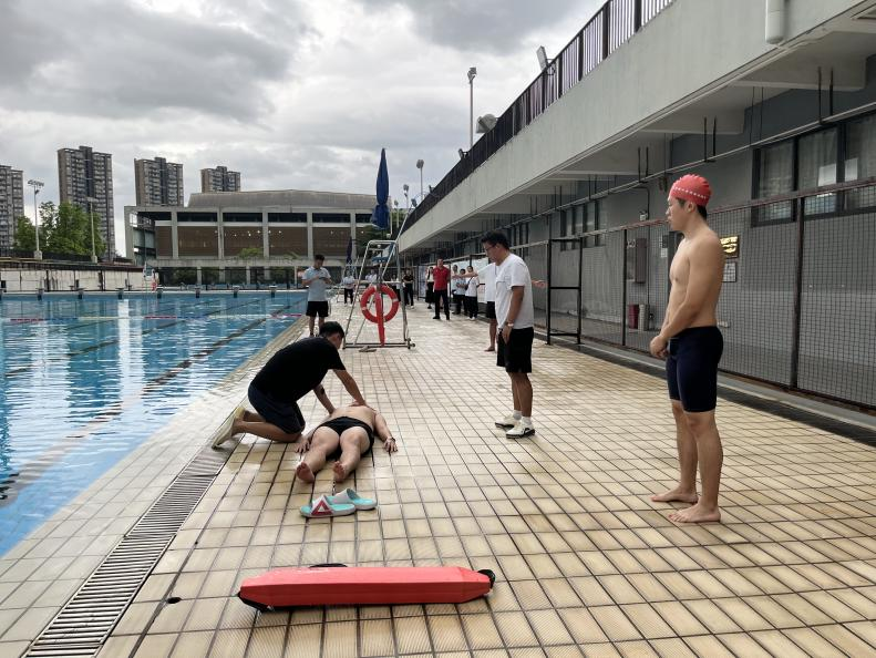 会议结束后,全体人员按预案开展泳池安全应急演练。现场模拟人员溺水、突发疾病等场景,救生员迅速响应,规范完成救援及初步急救。随后众人前往急救室进行模拟心肺复苏练习,在专业指导下掌握操作要点,提升救援能力。