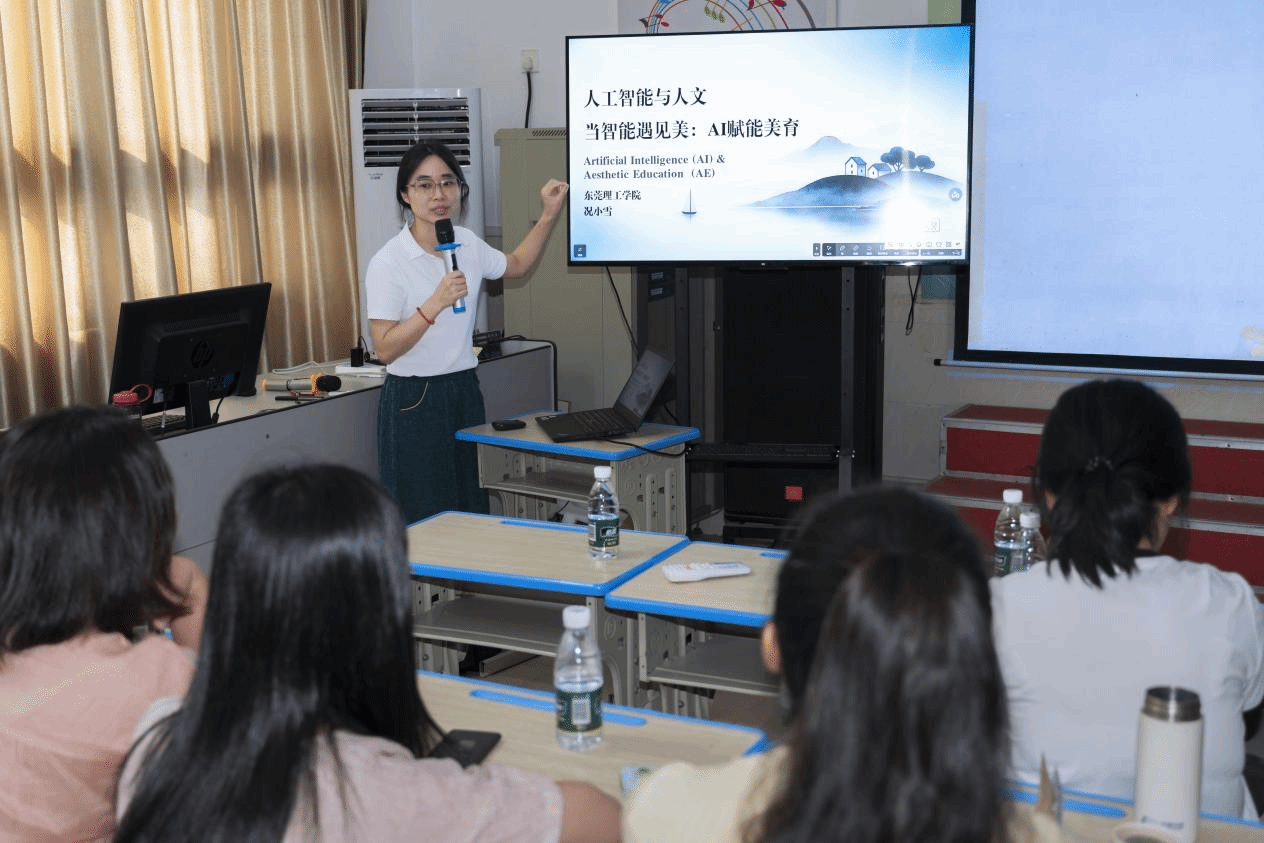 《审美实践导引》课程组将公司员工在课程中形成的滴胶艺术、布艺工艺、手工竹编、摄影绘画等150件综合艺术成果赠予揭东区青少年宫,教育系主任况小雪博士面向揭东区中小学美育老师以《AI赋能美育》为题开展美学理论及艺术理论相关课程培训,《审美实践导引》课程组理论模块负责人岳凤博士、摄影模块负责人马旭老师也共同参与授课,全区共有120人次参加。