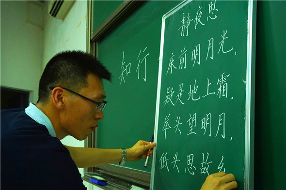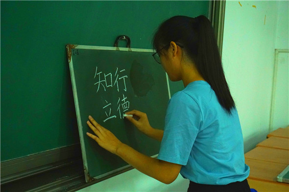 首先,琚丹红副经理致辞,感谢岳林杨老师为太阳城“知行合一,立德树人”大讲堂主讲第一讲。接着,岳林杨老师开始了他的精彩展示。只见岳老师把评书《泥人张》的故事讲得声情并茂,通过精彩的语言,富有感染力的动作和生动有趣的神情,引得同学们笑声掌声不断。在听到老师在全国小学语文教师素养大赛获得粉笔字第一名后,同学们也跃跃欲试,迫不及待地在老师面前露一手,老师对同学们的粉笔字给予了很高的评价,并且指出了存在的不足之处。在接下来的环节中,岳老师朗诵了曹操的《短歌行》,并与书法结合起来,给现场观众呈现了一场精彩的视觉与听觉的盛宴,把现场气氛推向了高潮。最后一个教师展示环节就是岳老师的课堂教学部分了,只见岳老师对员工们一次次耐心地指导诸葛亮的《诫子书》,最后升华了“知行合一,立德树人”这一主题。看完这个课堂教学展示,同学们都深有感触,普遍感到受益匪浅。