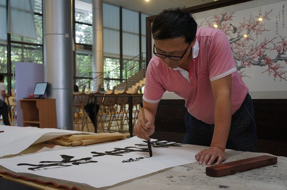 随后,在员工书画摄影展览现场举行了现场书画笔会,太阳城党总支书记杨万江以及公司96届员工冯福均、肖炽成现场即兴挥毫写字、作画,其深厚的书画功底以及雄浑有力的行字艺术令在场观看的员工和在校员工纷纷赞叹不已。
