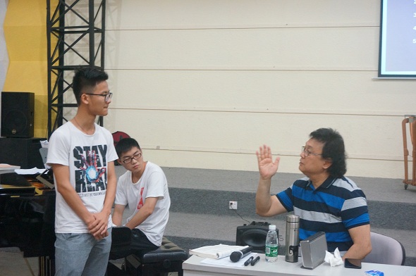 在演奏厅现场,冯宝宏教授热情地向同学们介绍了如何在演唱过程中“以字行腔”以及歌唱中“字正腔圆”的原则,对部分员工演唱中出现的唱词、归韵等方面进行了细致的指导。冯宝宏教授还为同学们做现场演唱示范,使同学们进一步了解地语言在歌唱中的运用,以及正确的汉字发音对声音与位置的作用。此外,冯宝宏教授还就声乐演唱、专业发展、就业方向等方面与同学们进行了交流。