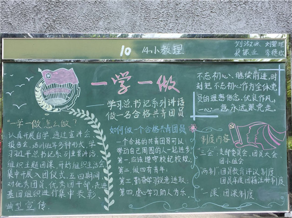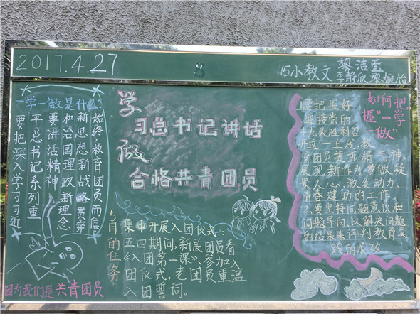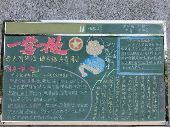 通过本次黑板报展演,同学们对一学一做的内容与要求有了进一步的认识,也使同学们思考如何做一个合格共青团员,让同学们明白身为共青团员的一份责任,有利于未来更顺利开展“一学一做”相关活动,有利于深入思想,使同学们在未来的学习生活中落实“一学一做”。
