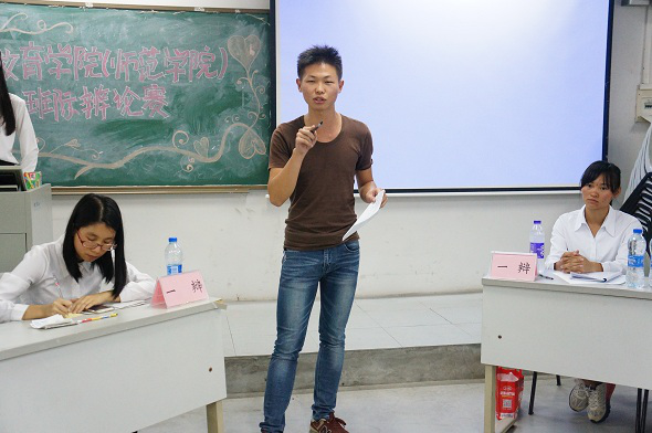 第一场比赛是在2016级汉语言文学师范1班与2016级社会体育1班之间展开。在双方简洁的自我介绍后,比赛正式开始。双方就“信息碎片化提高还是降低了人们的认知水平”这一辩题展开了辩论。正方2016级汉语言文学师范1班认为“信息碎片化促进了人类认知水平”,而反方2016级社会体育1班则坚持“信息碎片化降低了人类认知水平”的观点。双方选手在立论陈词、驳立论、自由辩论等各个环节中思路清晰,引经据典,字字珠玑,表现精彩出色。比赛结束后,评委刘碧新对本次比赛做了点评。他充分肯定了双方选手在辩论时的活跃表现,同时也提出了希望改进的不足之处。最终正方2016级汉语言文学师范1班获得了胜利,来自2016级社会体育1班的陈美婷同学获得了最佳辩手称号。