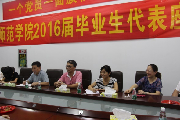 2016年6月19日下午,师范学院在艺术楼举行了2016届毕业生纪念品赠送揭幕仪式。仪式结束后,在艺术楼A303会议室举行了2016届毕业生代表座谈会,师范学院副经理陈庆祝、党总支书记杨万江、党总支副书记黄艺琦、副经理琚丹红、辅导员诸小妮、袁志军以及2016届的毕业生代表出席了本次座谈会。
