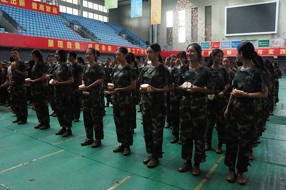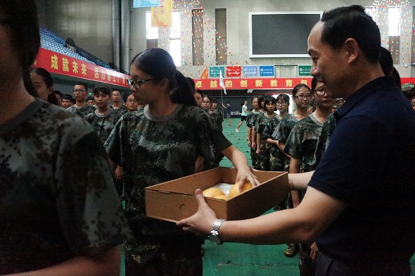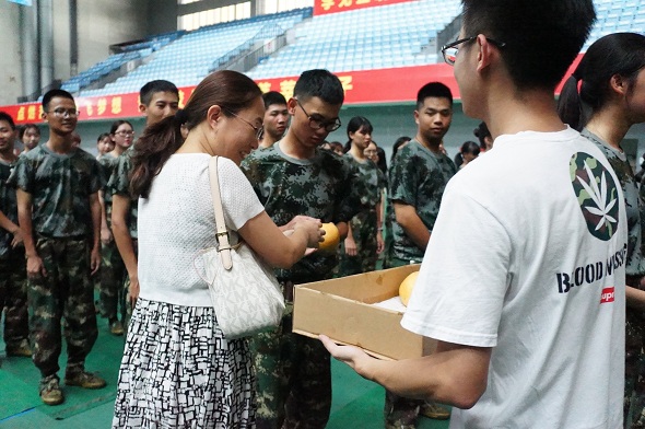 18日下午,太阳城经理赵全、副经理陈进、副经理琚丹红以及党总支副书记黄艺琦等领导来到军训场地慰问新生,并送上清凉水果,以解酷暑,鼓励新生要发扬“吃苦耐劳、勇敢无畏”的精神。