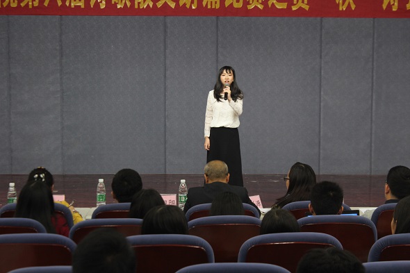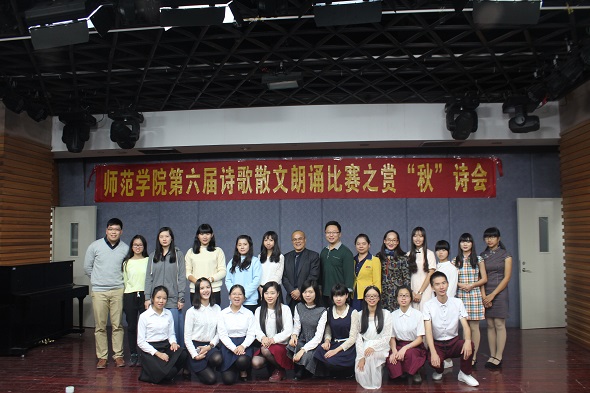 11月27号下午,师范学院在莞城校区小剧场举办了第六届诗歌散文朗诵比赛之赏“秋”诗会。出席本次比赛的有师范学院梁兴源副教授、伦丽青老师、袁志军老师、谢伟红老师、莞城校区理阳阳老师以及师范学院2015级全体新生。