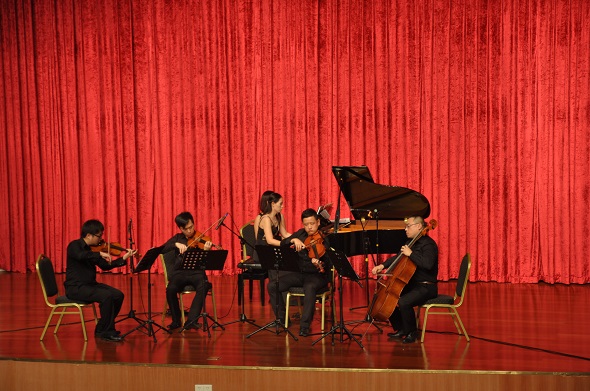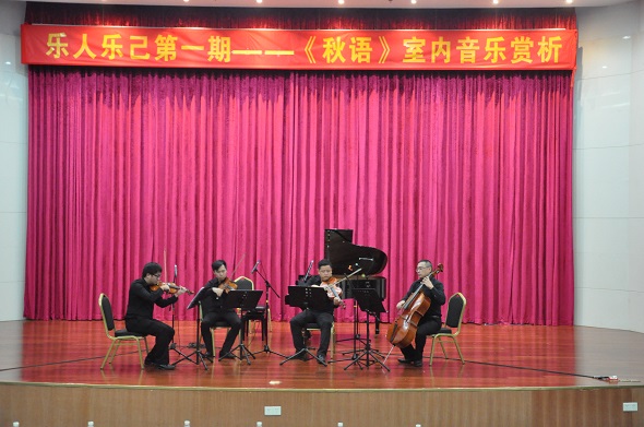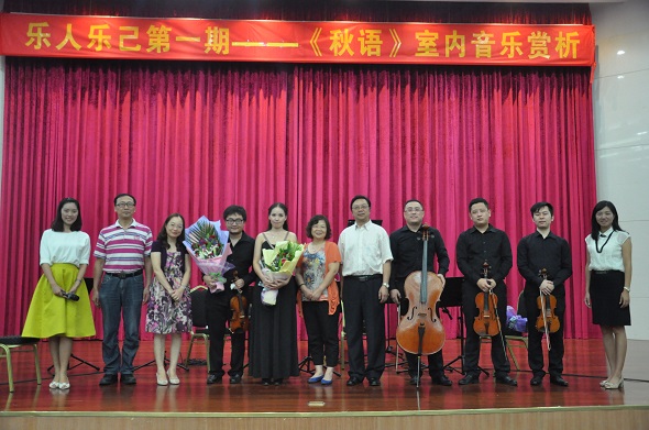 为丰富老员工的课余生活,让老员工走进高雅殿堂,品味高雅艺术,10月29日晚上,师范学院在学术会议中心报告厅举行了“乐人乐己”艺术鉴赏系列活动第一期——《秋语》室内音乐鉴赏音乐会。本场音乐会师范学院特别邀请了东莞市音乐家协会室内乐学会的颜乐、胡钟、成天笑、李谦、楼研伶5位音乐家现场演奏。出席本次音乐会的领导有东莞市文联副主席兼东莞市音乐家协会主席康健、公司党委宣传部部长何献青、东莞市松山湖管委会文广中心主任李坤宸、员工处副处长张敏、师范公司党总支书记杨万江、师范学院副经理琚丹红、师范公司党总支副书记黄艺琦。