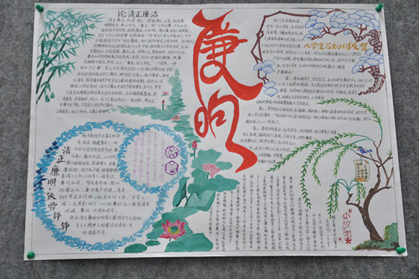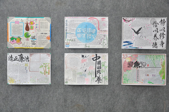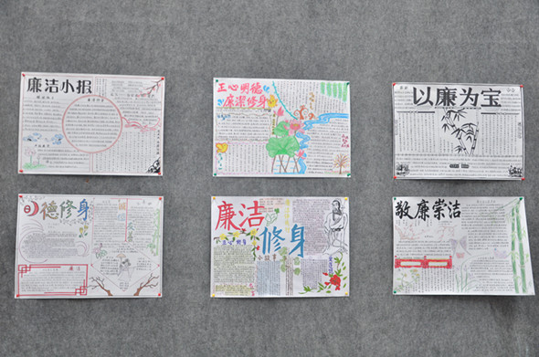 为了丰富同学们的校园文化生活,培养员工动手、动脑能力,对老员工深入开展纪律教育和学风教育,提高老员工廉洁诚信意识,为高水平理工科大学建设提供纪律保障,师范学院于2015年9月15日----11月15日举行了“反腐倡廉,廉洁修身”手抄报比赛。