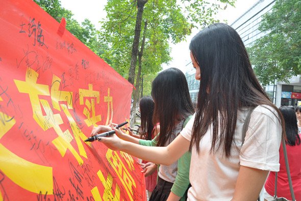 签名活动开展得十分顺利,慢慢地,横幅上已是满满的签名了。可是,同学们的热情依然非常高涨,还有很多刚入学不久的大一新生们都纷纷在横幅上写上了自己的名字。