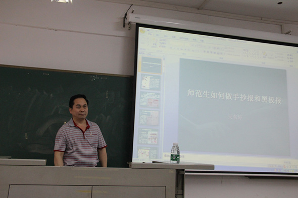 吴东涛副教授开篇就为大家讲明了做好手抄报和黑板报对师范生具有重要意义,接着吴副教授从版面设计、报头、图案、视觉效果等方面讲述如何出好手抄报和黑板报,吴副教授不仅告诉同学们编绘制作手抄报和黑板报的步骤,还强调了师范学院的评分标准,最后吴副教授还给大家分享了往年优秀作品。在培训过程中,同学们在台下认真听讲,还不时埋头做笔记。