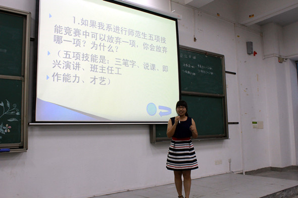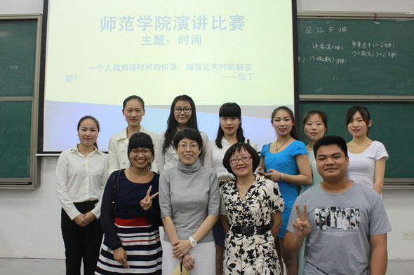 为了提高师范生的演讲能力,2014年4月27日晚上,师范学院在教学楼6E306教室举行了第五届师范生基本功展演“中文演讲比赛”。出席比赛的老师有师范学院郑陶凌老师、张郿老师。师范学院的全体员工观看了比赛。