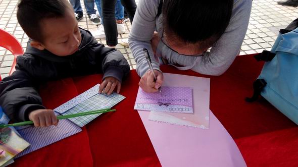 活动开展前,志愿站干事精心布置活动现场,积极开展活动宣传工作,详细向路人介绍活动的具体事项和目的。引导小孩子和家长们在信纸上写字或画画,以表达自己的梦想,再帮其折叠好装进信封,最后由志愿者投递出去。活动现场不断吸引路人的关注和参与。参与到本活动的小孩和家长热情十分高涨,尽情抒发自己内心的想法。