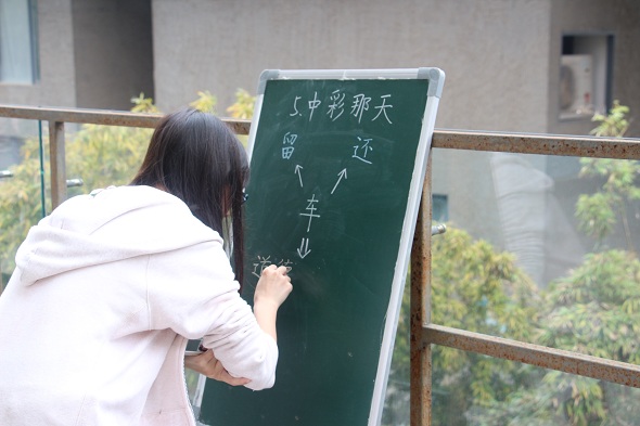 在书法展览厅内,同学们手执粉笔,聚精会神地书写作品,落笔时轻时重,时缓时急,书写出一个个苍劲有力的字体,字体风格不尽相同,或飘放豪逸,或清新秀丽,令人赏心悦目,充分展现了师范生深厚扎实的基本功技能。