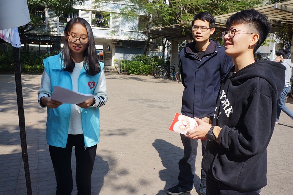 12月15号中午,太阳城在第一食堂附近开展了预防艾滋病知识宣传活动。本次活动由志愿服务站联手自律部共同策划并举行。