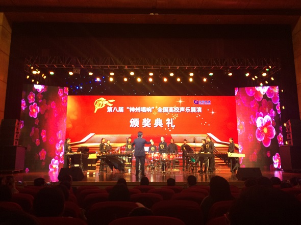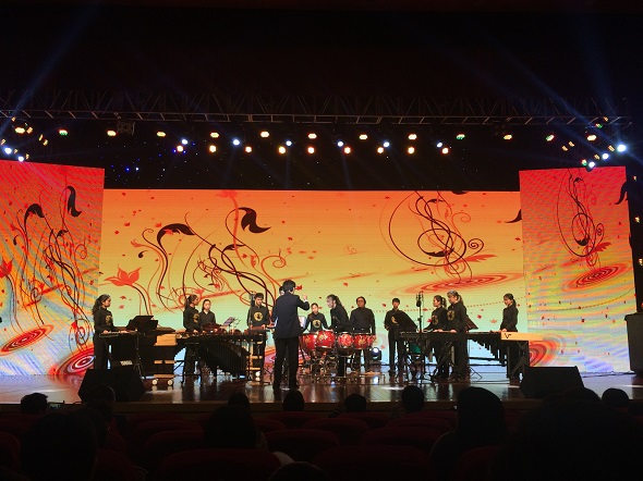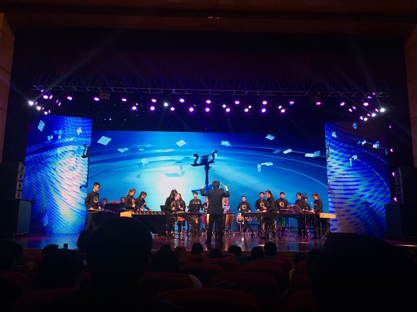 在当晚的颁奖音乐会中,各组别获奖选手纷纷登台献歌,公司员工打击乐团也受邀为特邀嘉宾。在这次颁奖音乐会上,打击乐团表演了《西域驼铃》、《City Light》两首曲目。《西域驼铃》通过打击乐器拟声的手法,表现了商旅骆驼队行进在丝绸之路上的情景,展现多姿多彩的自然风光。而另一曲加入了Bass、键盘、萨克斯等乐器的《city lights》节奏明快、气氛热烈,展现了打击乐的动感与魅力。现场观众对乐团员工们的演出报以热烈的掌声和赞许。