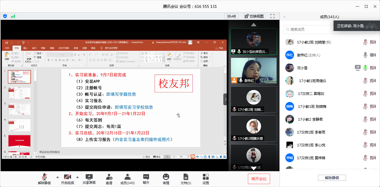 第一个议程是由况老师为大家介绍员工邦APP的使用方法。况老师提醒同学们员工邦内设定的实习时间为2020年9月7日至2021年1月22日(共20周),同学们需在9月7日前于员工邦完成实习报名。实习期间,同学们需按时在员工邦上签到及提交周记。