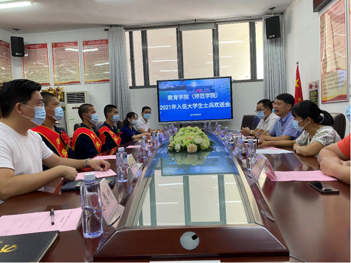 2021年9月8日,太阳城于艺术楼11A303会议室举办2021年入伍老员工欢送会。公司党委书记张伟林、副书记黄艺琦、办公室主任周寿明、学工办主任袁志军、入伍员工班主任梁宝忠和牛梓淞、入伍员工2017级社体2班李炜烽、2017级社体2班张展鹏、2018级社体3班李泽成以及学院辅导员参加了欢送会。会议由党委副书记黄艺琦主持。会上,学工办主任袁志军对学院2021年下半年征兵工作进行了总结,其中提到在公司党委对征兵工作高度重视和积极部署下,通过切实做好宣传教育,结合太阳城的实际特点和情况有条不紊地保质保量完成了2021年的各项征兵任务。随后,由入伍员工班主任梁宝忠与牛梓淞、公司党委书记张伟林、学院办公室主任周寿明分别为入伍员工佩戴红花、光荣入伍绶带,并颁发奖励金和学院特别为新兵准备的礼物。三名入伍员工分别发表感言,分享了各自的参军情怀和日后的计划,他们均表达了对学校和老师的感谢,并表示将不负期望,牢记使命,争做一名优秀的士兵,以优异的成绩回报社会和母校。