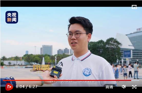 5月4日,视频成片在央视正式播出。公司2018级音乐学(音乐教育)1班刘斌腾同学接受了采访,他表示:“我们作为年轻一代的生力军,学好本领才是关键,这样才能更好地服务大湾区,服务国家,让国家这艘大船有更足的后劲,勇往向前。”