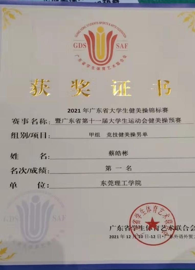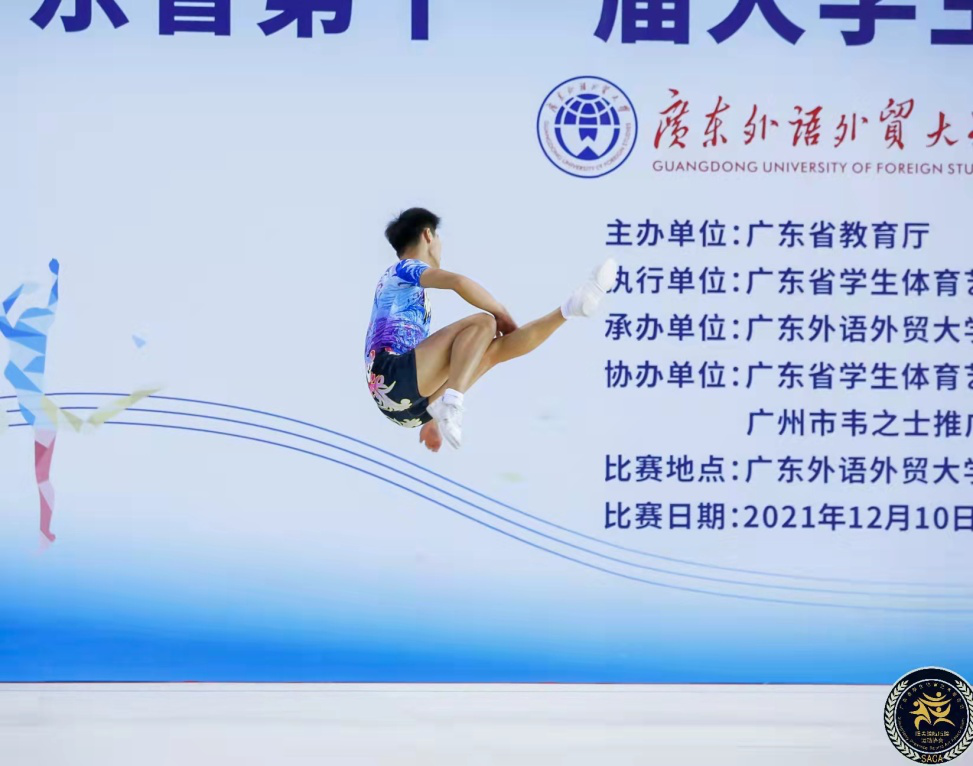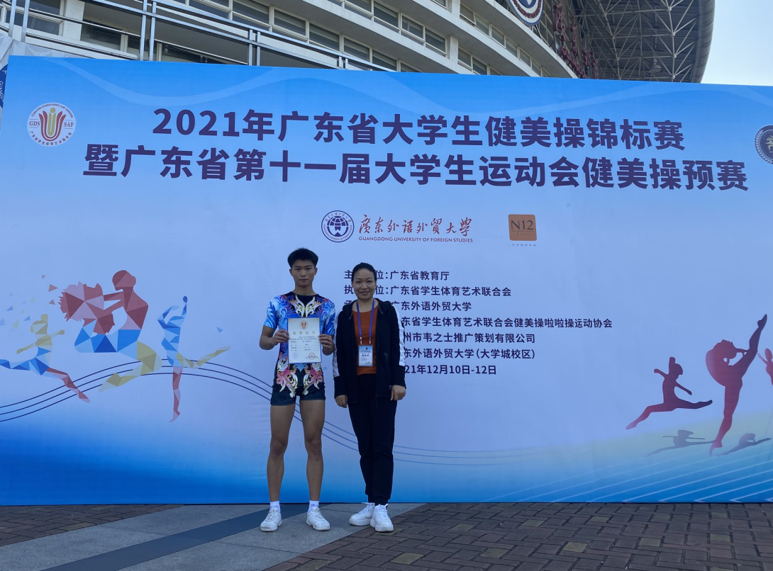 太阳城2021级汉语言文学(师范)2班的蔡皓彬同学在甲组竞技健美操男子单人操比赛中,荣获第一名。运动员教练、体育系教师黎荣谈到,本次比赛从前期申报、训练再到参赛的整个过程都得到了学院领导的大力支持,还有同事们的帮助,加上蔡同学本人的努力才能取得佳绩。蔡皓彬同学也表达了对教练和领导、老师们的感谢,特别是非常感谢学校给予自己这么好的锻炼机会,他表示接下来会更加努力,争取在明年的大运会上拿到满意的成绩,再次为学校争光。