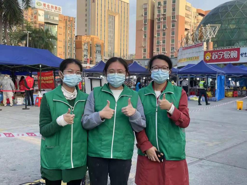 2021年12月20日,由于疫情被封控在大朗实验小学的2018级汉语言文学(师范)1班陈水婷、2018级小学教育(师范)1班王彩仪、袁淑盈三位实习生积极响应大朗镇教育系统疫情防控志愿服务队的组建,主动加入到大朗实验小学志愿服务队,并于12月21日和24日分别在大朗圣堂社区协助进行第六轮和第七轮大规模核酸检测工作。