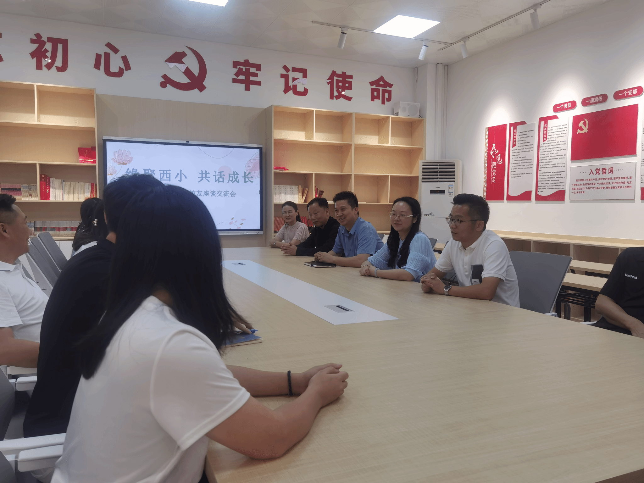 签约授牌仪式结束后,院校双方领导和西溪小学任职的多位学校员工欢聚一堂,座谈交流。学校毕业生和母校老师一起忆往昔,聊家常,谈收获,话成长,汇报如今的工作情况,学院领导寄望老师们牢记母校嘱托,求真务实,以爱育人,为西溪小学的发展贡献力量,为东莞的基础教育添砖加瓦。