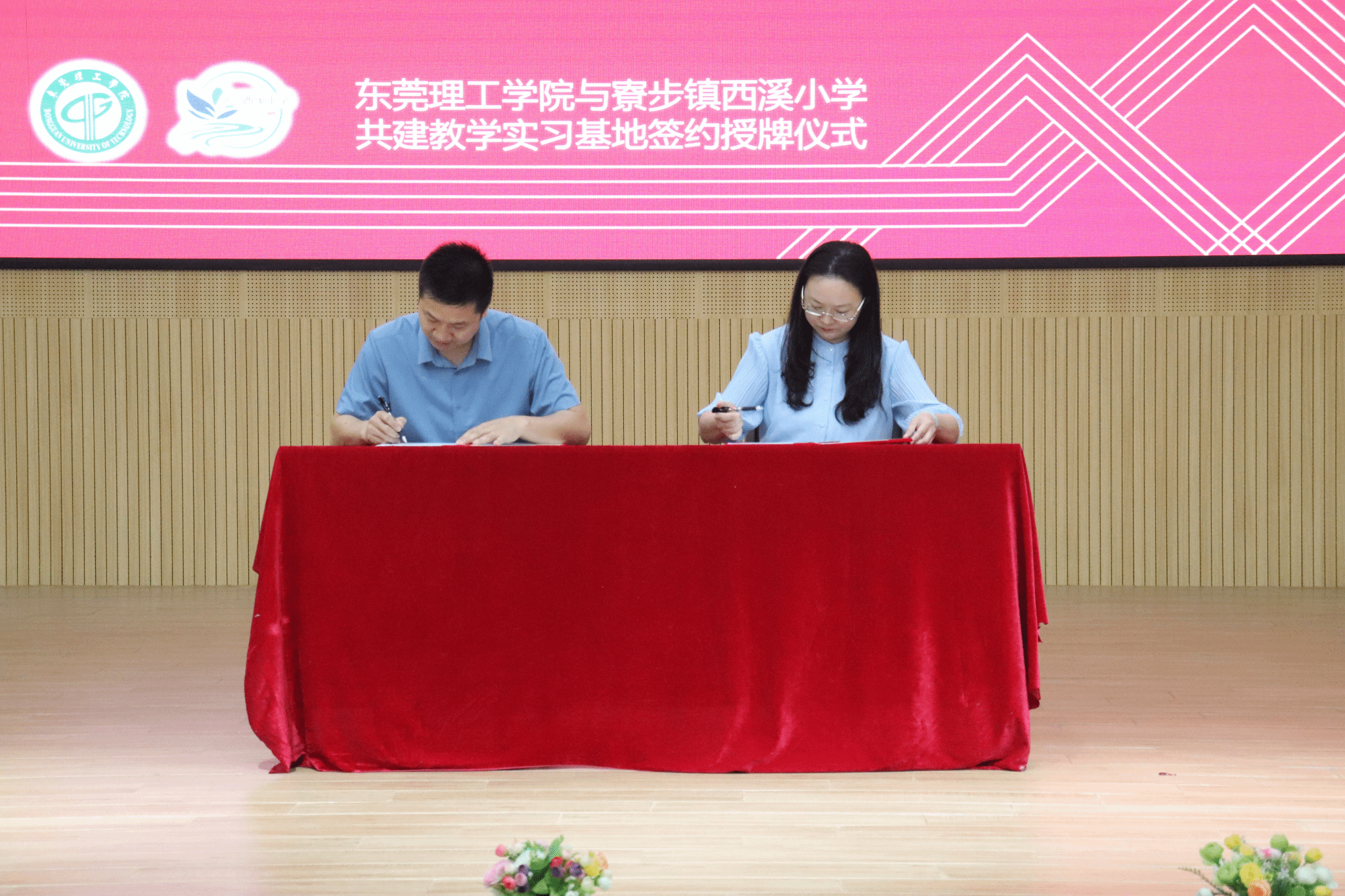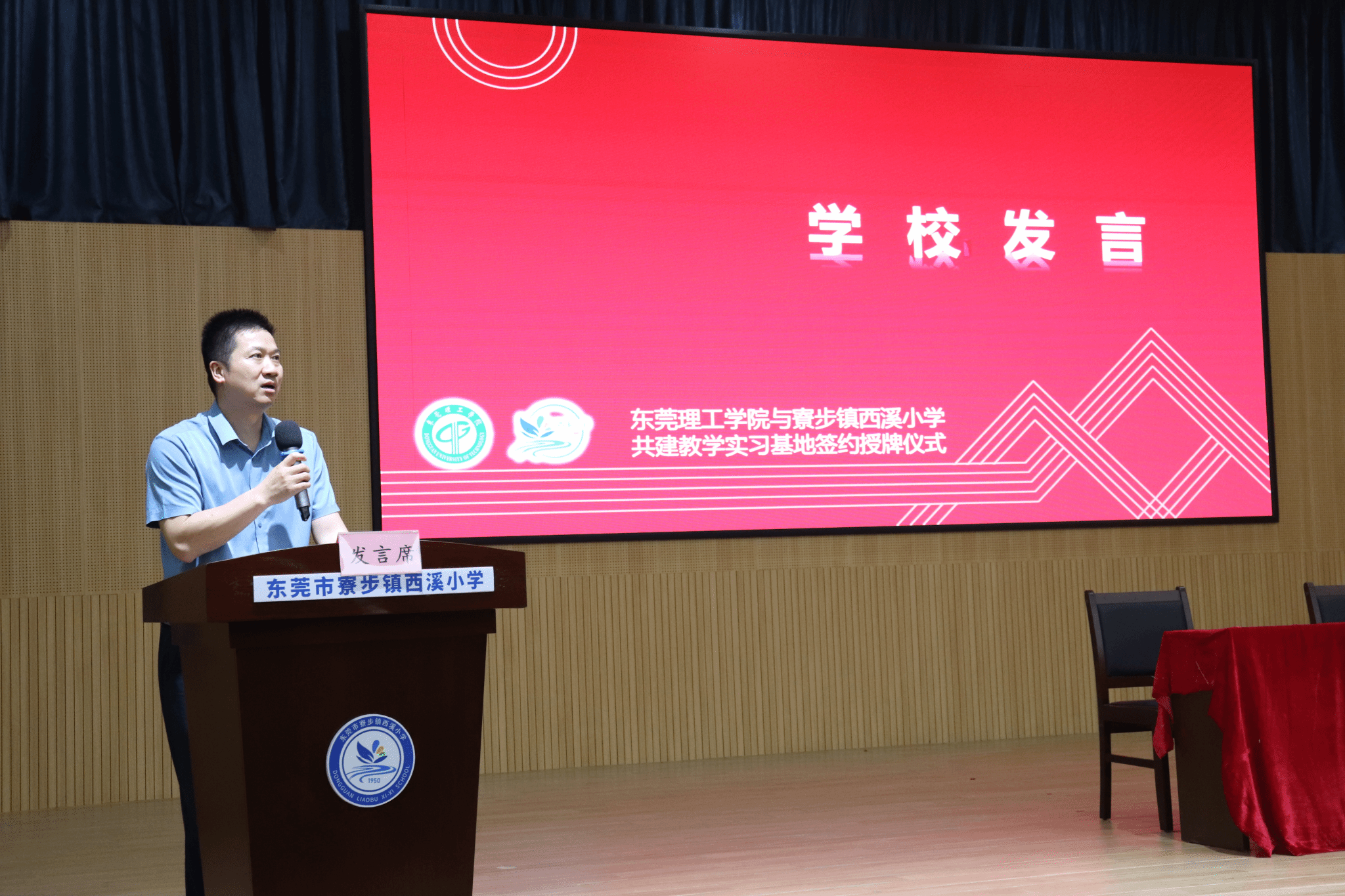 4月11日,公司教育实习基地签约授牌仪式在寮步镇西溪小学闻道讲堂举行。副经理黄琼、音乐舞蹈系副主任林雄文、音乐舞蹈系器乐教研室主任谭敏、舞蹈教研室主任张贻华等一行6人,寮步镇西溪小学党委书记兼董事长谭贵新、专职副书记陈升旭及学校各科室行政领导,西溪小学家委会代表和西溪小学教师代表等出席此次仪式。