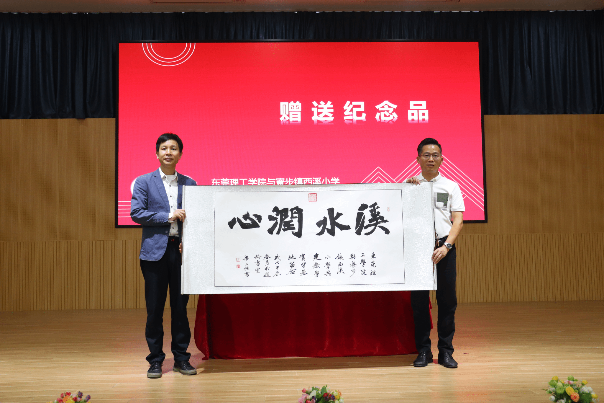 西溪小学专职副书记陈升旭代表学校向学院赠送纪念品,音乐舞蹈系副主任林雄文代表接受纪念品。该幅书法作品由著名书法家林光进先生弟子梁二柱老师所作,“溪水润心,生态成长”是西溪小学办学文化的凝练,体现着教育对员工内心的润泽和滋养。作品以魄力雄强、气象浑穆的魏碑书体书写,刚劲唯美,也寄托着师生们对两校共建教学实习基地协同发展的美好祝愿。