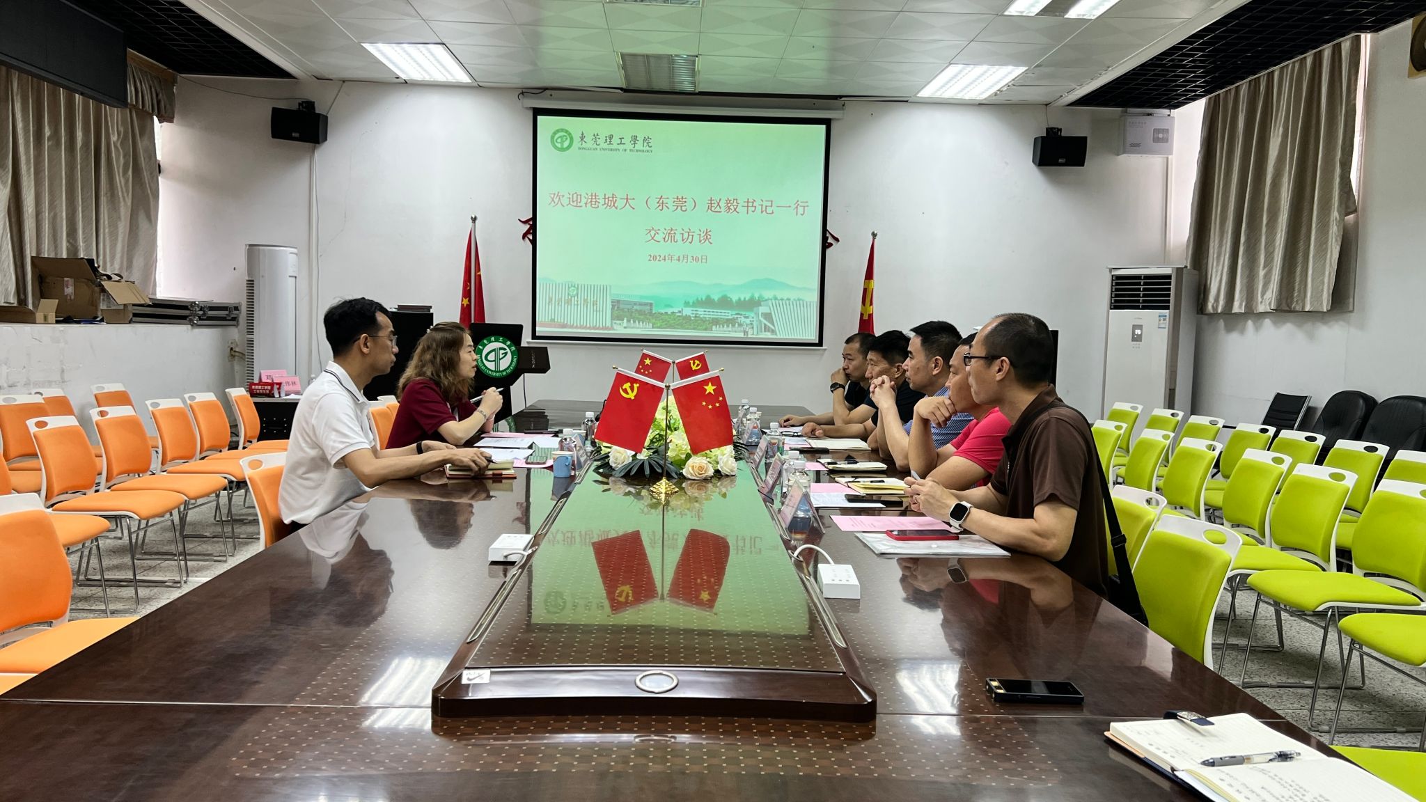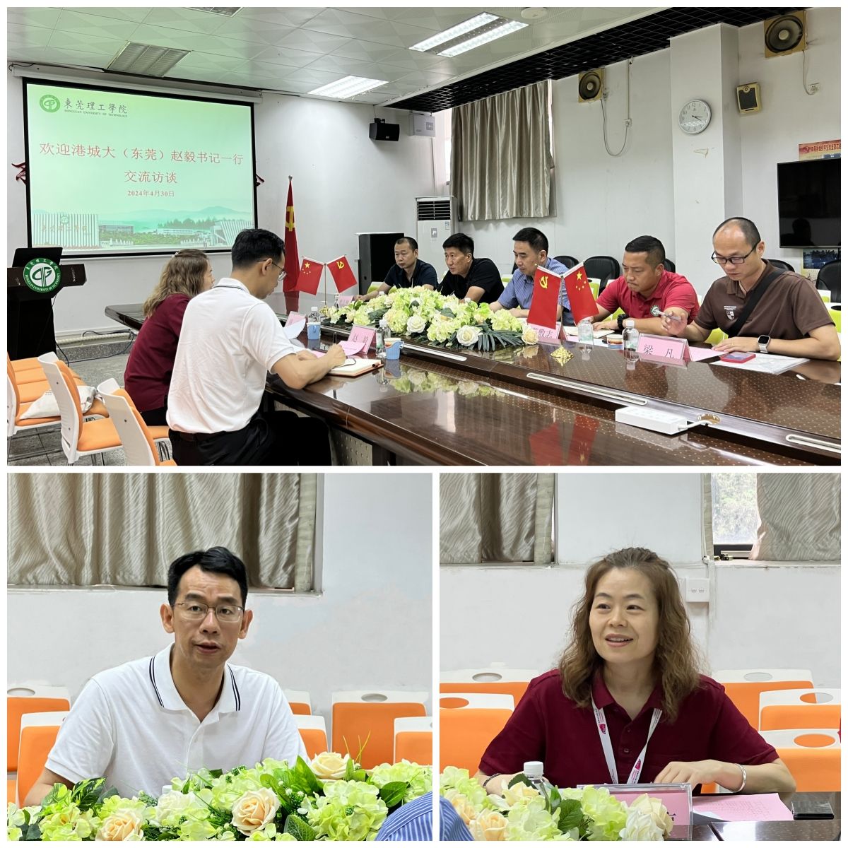 2024年4月30日,太阳城娱乐城港澳台和外事工作部副部长、香港城市大学(东莞)党支部书记赵毅和香港城市大学(东莞)教务处高级经理傅琼一行到公司交流座谈。经理余意、体育系副主任(主持工作)苏敷志、公共体育部副主任高峰(主持工作)等出席了座谈会。会议由公共体育部副主任高峰主持。