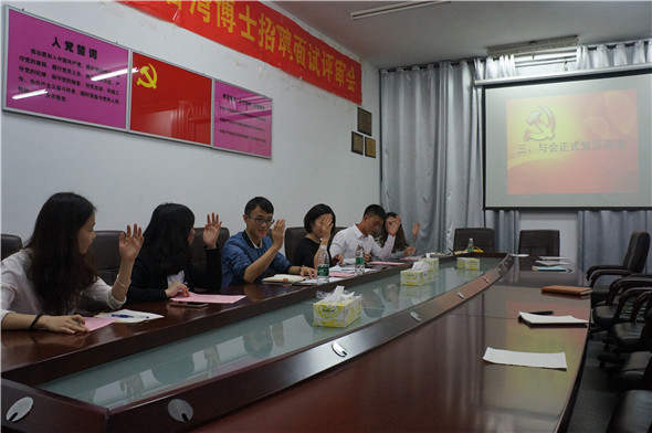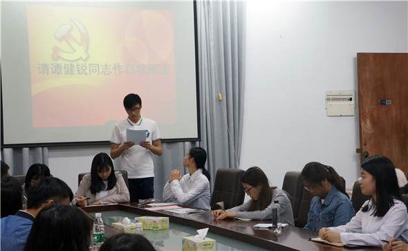 会议伊始,在场全体人员肃立,奏唱国歌。随后,邓静敏、莫菁华、李穗欣、谭健锐四位同志分别做自我阐述,相关介绍人介绍了四位同志的主要情况。在了解四位同志的基本情况后,与会正式党员进行了讨论及表决,最终决定接收邓静敏、莫菁华、李穗欣、谭健锐为预备党员。在会议的最后,全体起立宣读入党誓词。