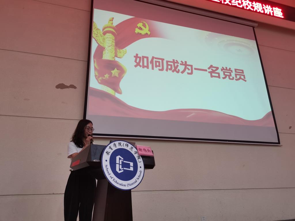 会上,员工党支部组织委员陆晓清围绕《如何成为一名党员》主题为新生做详细讲述。她强调入党的同志首先要端正入党动机,那些入党动机不纯,企图通过党员称号获取好处的决不吸收入党。接着,她向同学们详细地讲述了入党的基本流程,帮助同学理清思路,以便做好入党准备。她着重介绍如何撰写入党申请书及注意事项,希望能帮助新生走好入党第一步。