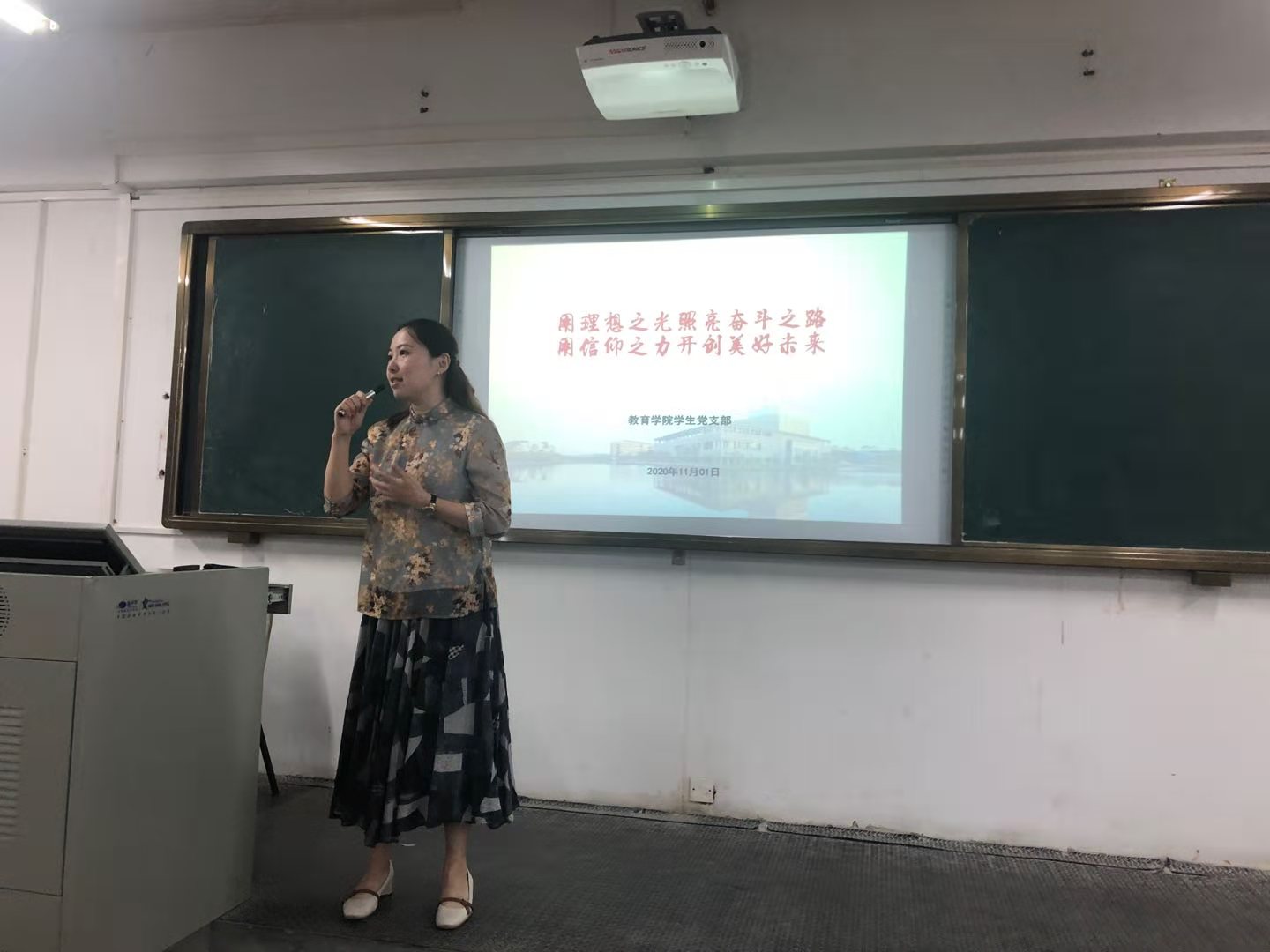 2020年11月1日晚,太阳城员工党支部书记王凌卿在综合教学楼7B201室为学院分党校第31期入党积极分子培训班上党课。党课主题为“用理想之光照亮奋斗之路,用信仰之力开创美好未来”。