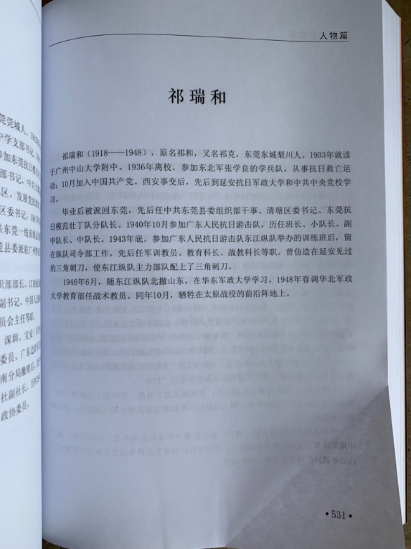 有关祁克烈士的现存资料很少,伦丽青同志为了尽可能全面地掌握他的事迹材料,先去了东江纵队纪念馆,不巧碰上闭馆维修,转而前往东城梨村翻阅《东莞市东城区梨川村志》,最后在东莞市委党史研究室借到《东莞抗日实录》《东莞解放斗争纪实》等书籍,查到了以上有关祁克烈士的事迹记载。
