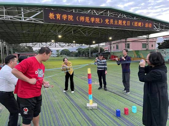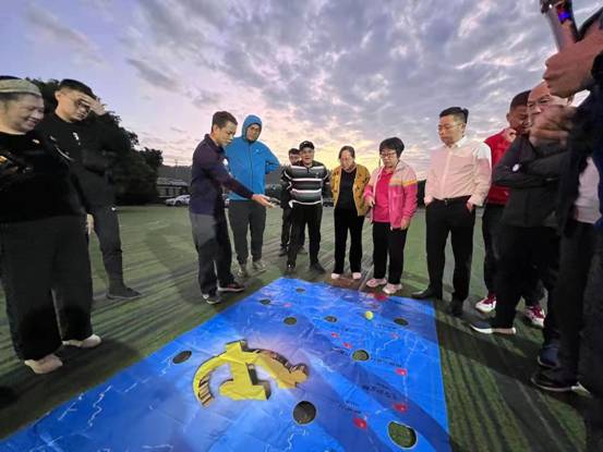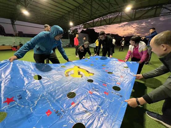 全体党员同志在训练基地教练的指导下进行破冰热身运动。经过分组后,三支充满活力的队伍确定了队长、队名和口号,并集体展示了编创的手势造型和队旗,为自己加油打气。为提高各队队员之间的合作精神和默契,在教练的组织带领下,三支队伍迅速进入状态,依次进行了同声报数、喊队号、画队徽、走队形、击鼓颠球等活动,增进了组内队员之间的认识与交流,气氛轻快而热烈。大家还参观了横岗湖研学基地的主要训练设施,并对相关训练内容进行了探讨。最后,三支队伍通过竞赛形式,共同完成“重走长征路”团建活动项目。在活动中,党员同志凝心聚力、精诚合作,不仅增强了团队合作意识,也使大家深刻领悟了长征精神和革命传统的教育意义。