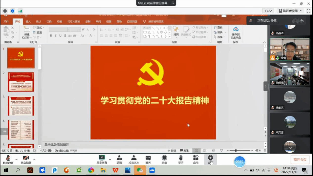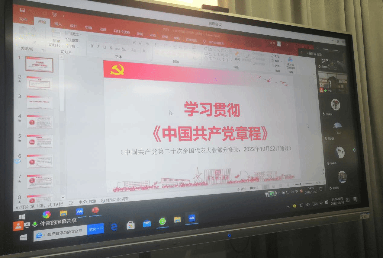 2022年11月10日下午,公司教师第一党支部在艺术楼A303会议室召开党员大会,通过线上线下结合的形式,学习党的二十大精神和开展“课程思政课堂教学设计初赛”主题党日活动。